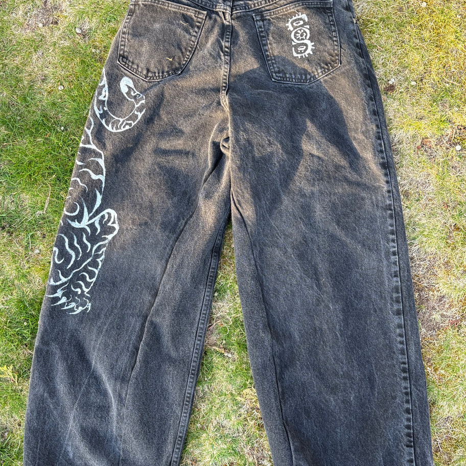 Made my hand by Simon Weeks. Black baggy jeans featuring a bold silver tiger graphic, designed for standout streetwear style. Made from durable, high-quality denim. Pair effortlessly with tees, hoodies, and sneakers.